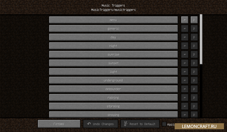 Для проигрывания музыки вам нужно положить свой музыкальный файл в формате ogg в папку config/MusicTriggers/songs/assets/musictriggers/sounds/music. После этого заходите в меню мода и указываете путь к нужному файлу для нужного триггера.