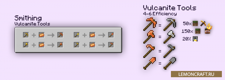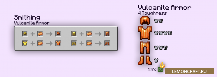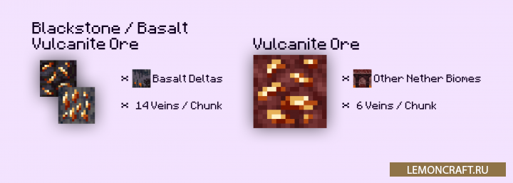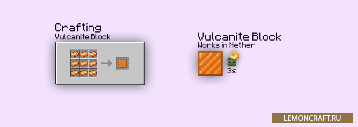 Мод на вулканит Extra Vulcanite добавляет в игру новый вид материала, вулканит, который не подвержен воздействию огня, а найти его можно в Нижнем мире. С помощью нового материала вы сможете создавать и улучшать броню и инструменты, которые получат защиту от огня. Кроме этого мод добавляет мазь, которая предназначена для защиты деревянных блоков от воздействия огня.